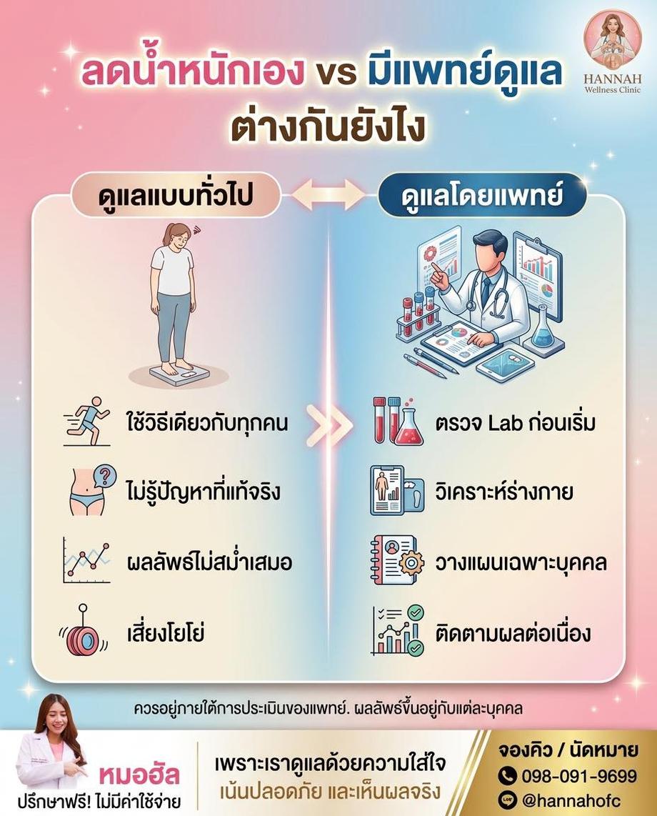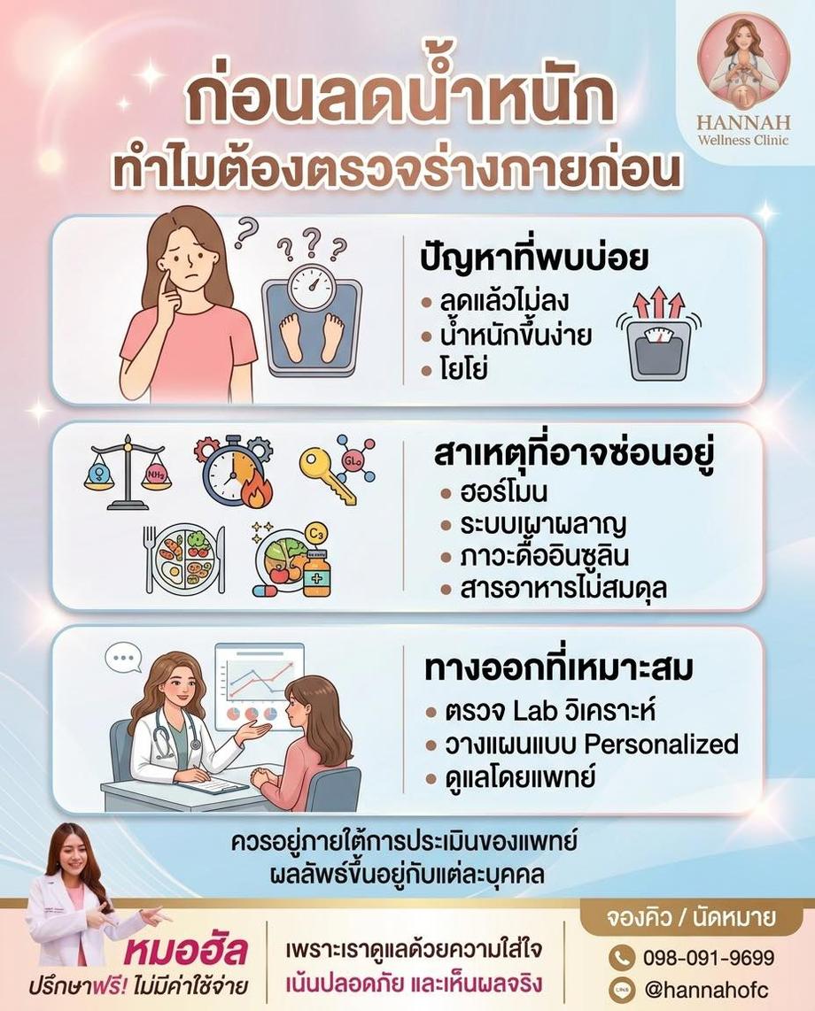 หากคุณกำลังมองหาวิธี ลดน้ำหนัก ที่ไม่ฝืนตัวเอง หรืออยากเริ่มต้น ฟื้นฟูระบบเผาผลาญ อย่างเป็นระบบ สามารถติดต่อทีมงาน Hannah Clinic เพื่อขอคำปรึกษา หรือกดปุ่มติดต่อ บนเว็บไซต์เพื่อนัดหมายพูดคุยกับแพทย์ได้เลย เพราะการดูแลสุขภาพที่ดี เริ่มต้นจากการเข้าใจร่างกายของคุณอย่างแท้จริง